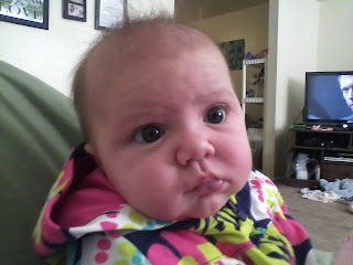 - Loves eating solid food. She first started with rice, and she was NOT a fan, so we tried oatmeal and she gobbled it up. Other random things we have given her and she has liked are: guacamole, tortilla chips, muffins, bread, clementines, and cheerios (they have to be in fourths though. haha). I want to start giving her other baby food this week to see how she does. She can't get enough of the oatmeal though. In between bites she raises her arms, opens her mouth, and says "oooh ooh ooh."